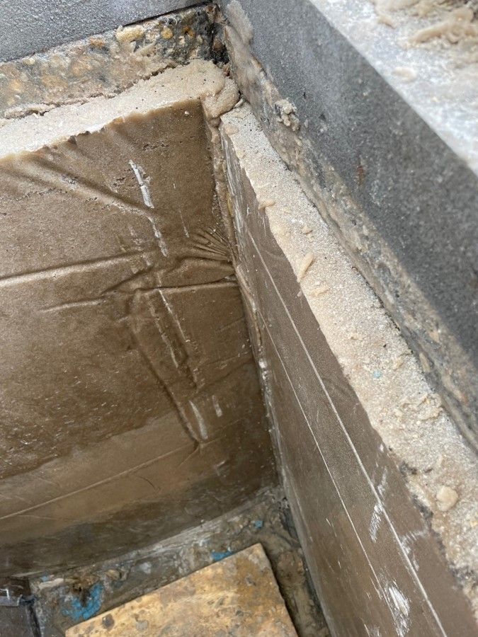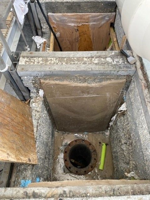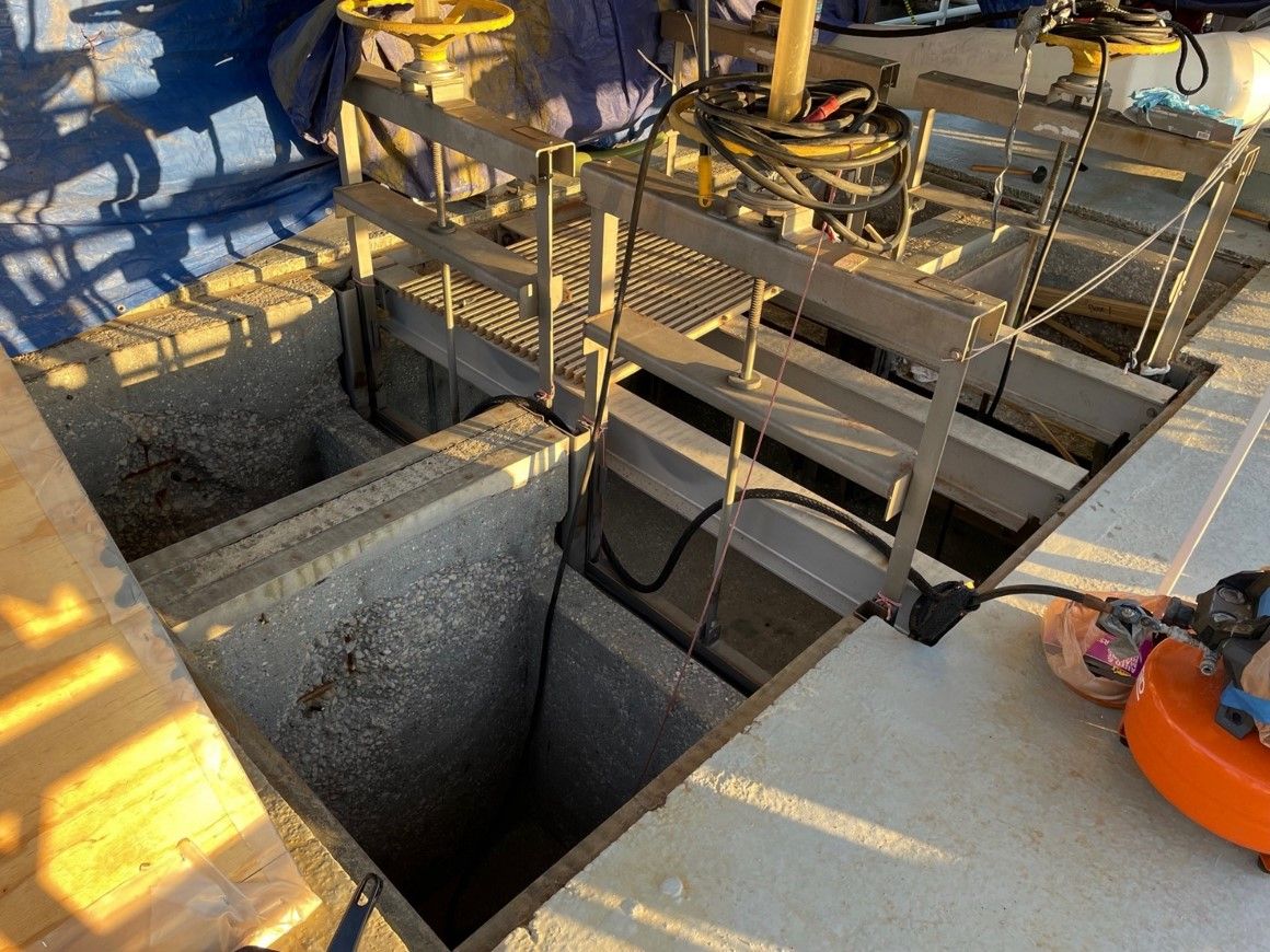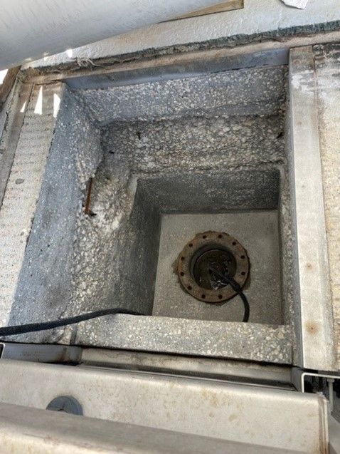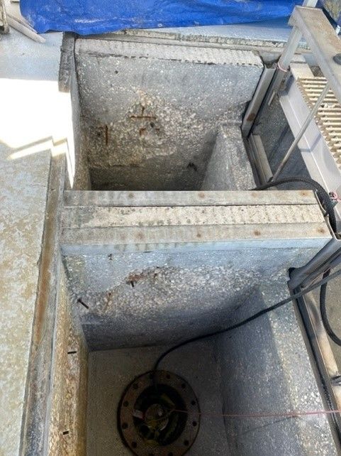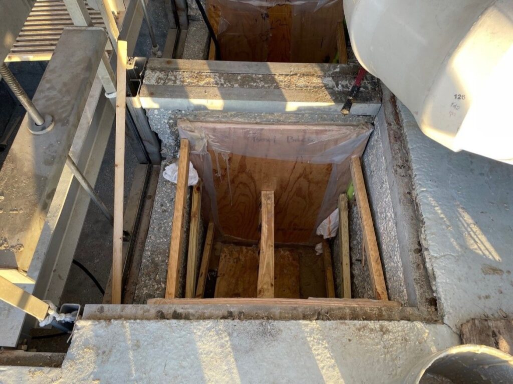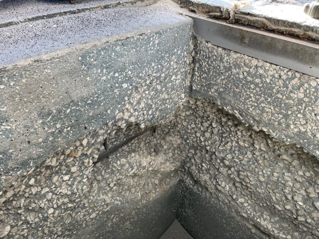 After grit blasting the concrete deep damage was discovered and all four sides would have to be repoured with epoxy and built back up to size. The ENECRETE DuraFill along with the ENECRETE DuraQuartz were selected to rebuild this box. Both of these materials have outstanding adhesion and have been proven to work in other applications. These products are 100% solids and will not shrink while they cure and can bond to the concrete and the rebar.