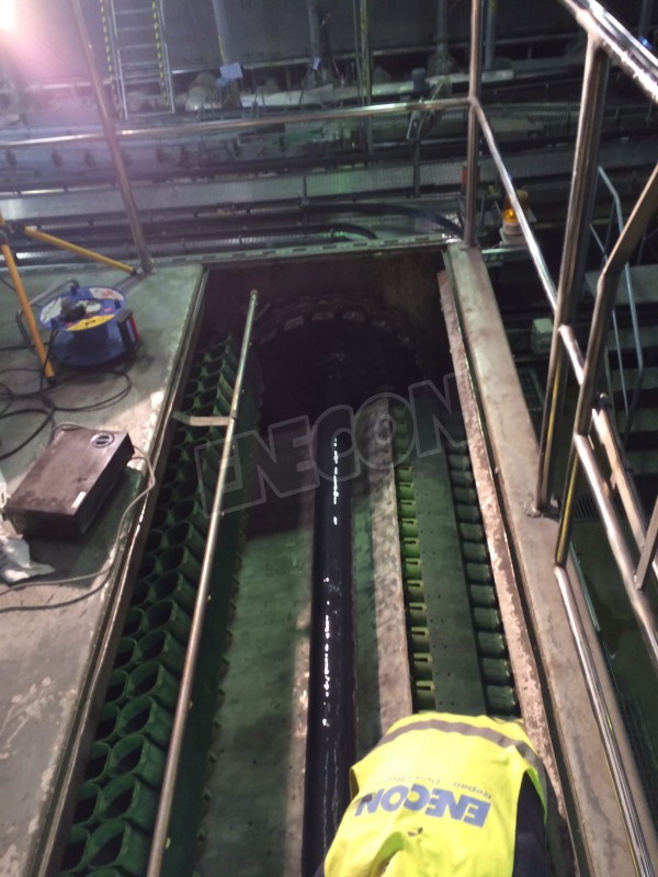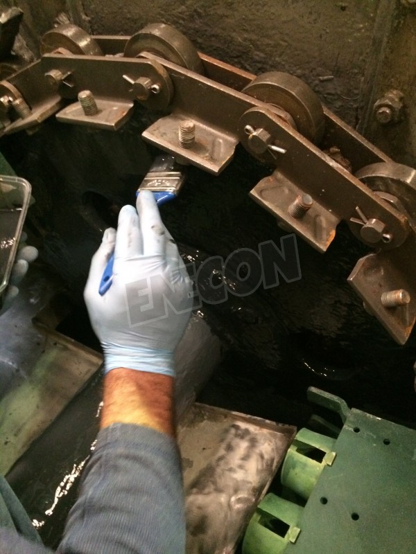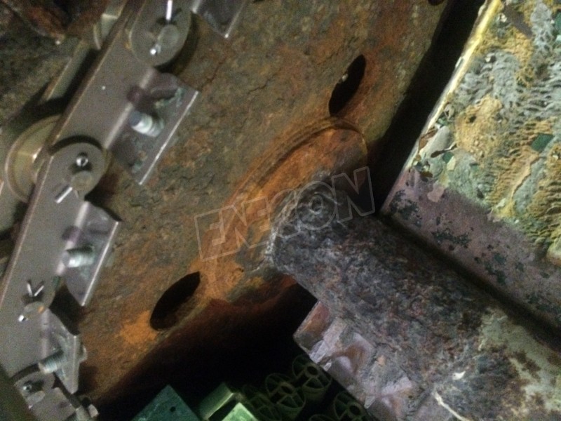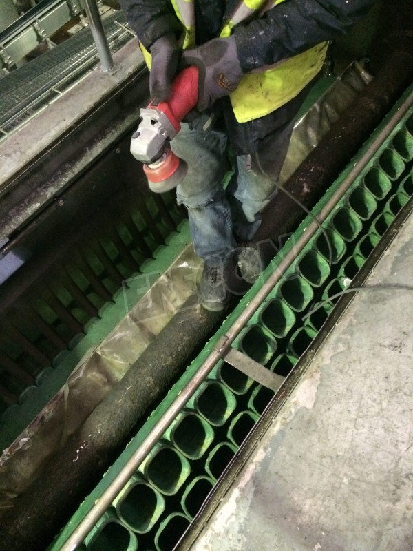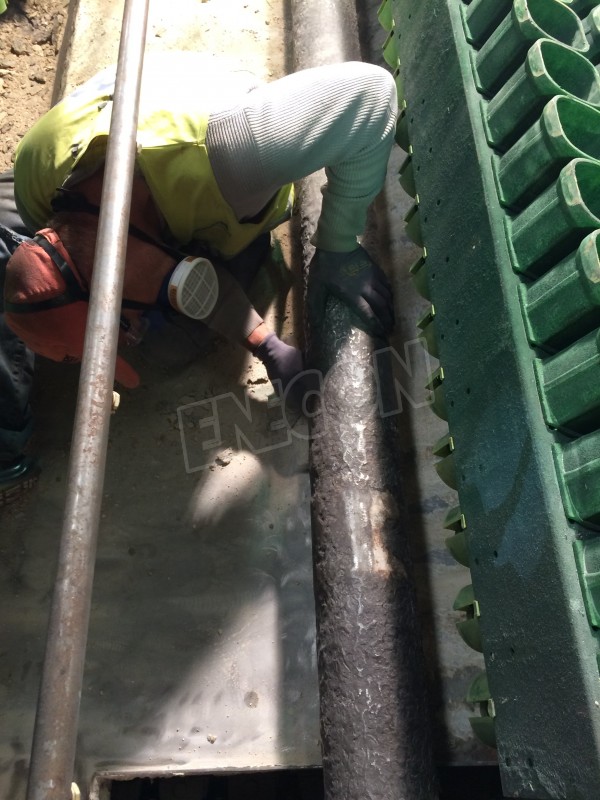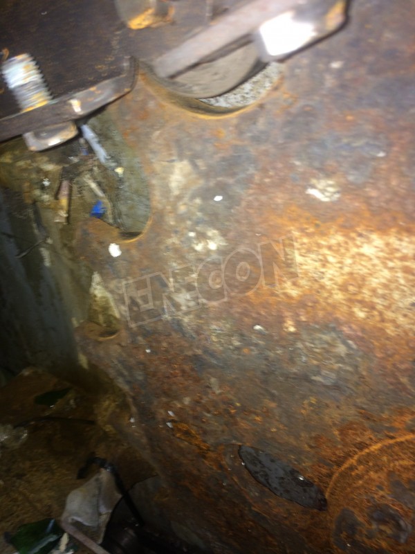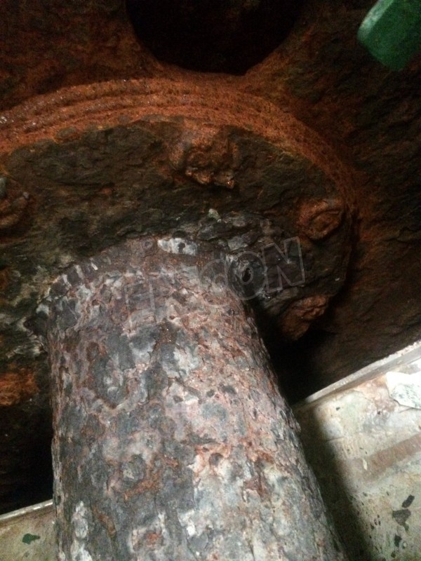Our works included grinding and manually sanding in order to remove all loose metal parts and corrosion. We washed all areas (shaft and side walls) with plenty of water and prior to commencing application of our polymers we cleaned off with acetone.