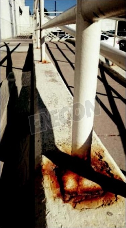 Besides simply removing the rust and coating the railing, it was observed that an original design flaw caused water and ice melt products to pond at the railing base flanges. This was the cause of the corrosion.