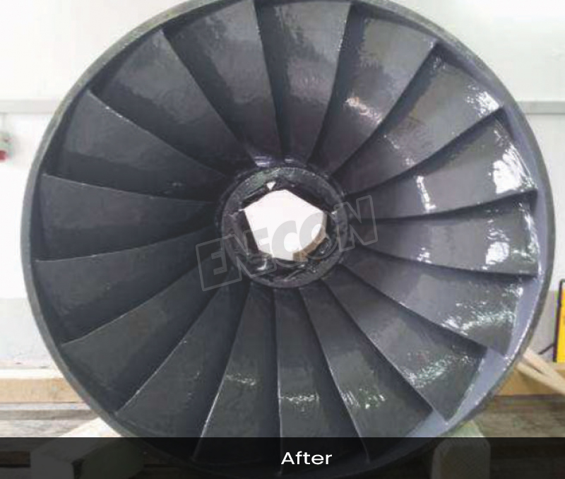 Solution: After grit blasting the turbine, the vanes were rebuilt by tack welding steel mesh to the deeply cavitated areas. The vanes were then rebuilt with CeramAlloy CP+AC then two coats of CeramAlloy CL+AC were applied. DuraTough DL was applied to protect against future cavitation problems.