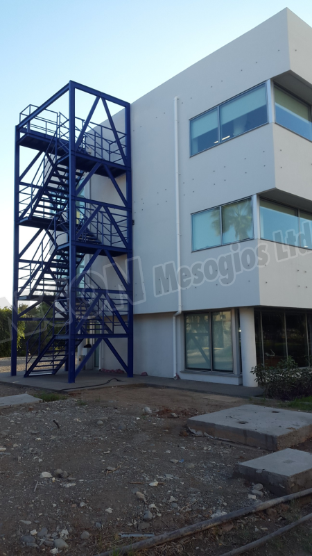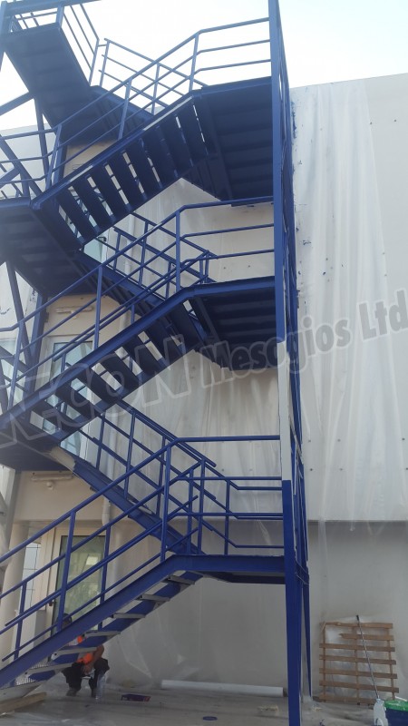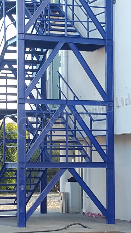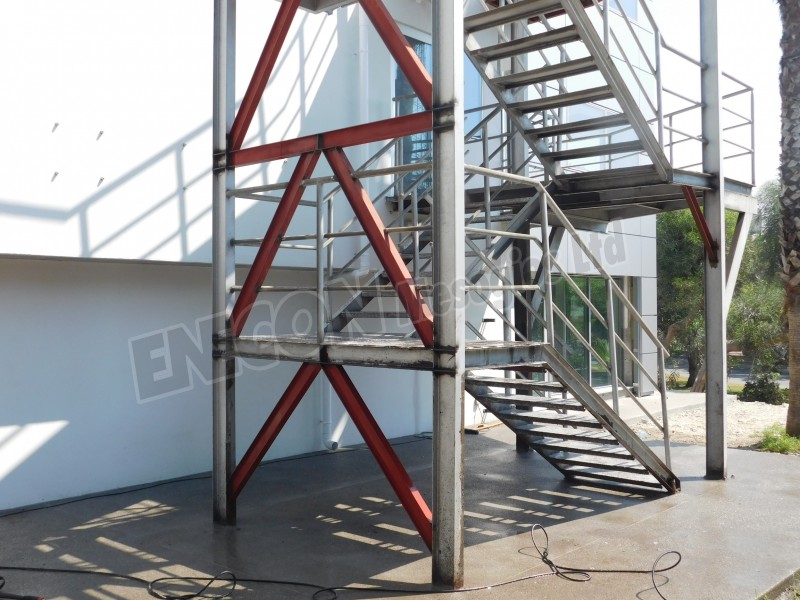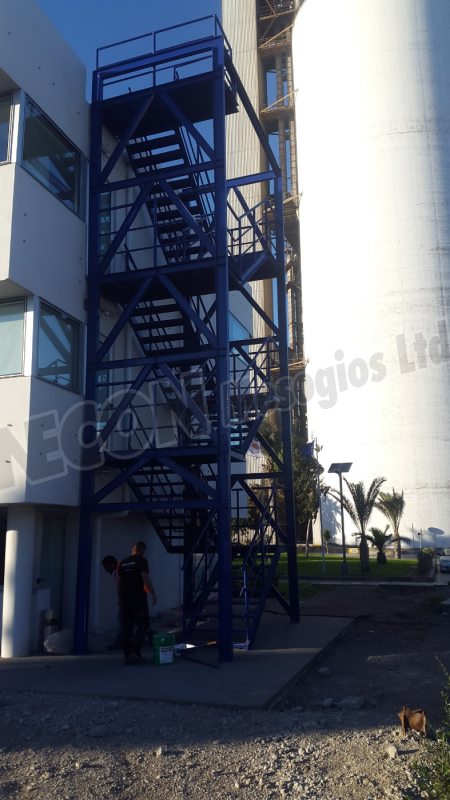 The two exterior metallic staircases needed protection from the corrosive environment not only from the sea (plant was located right on the sea) and also the corrosive dust created by cement manufacturing.